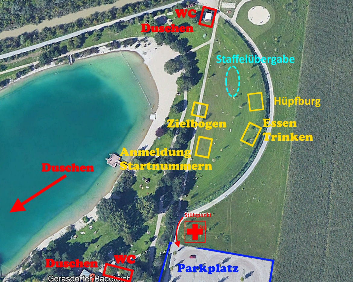 Die Zugänge zum Eventgelände befinden sich bei der Kassa oder direkt vom Parkplatz über die Laufstrecke.